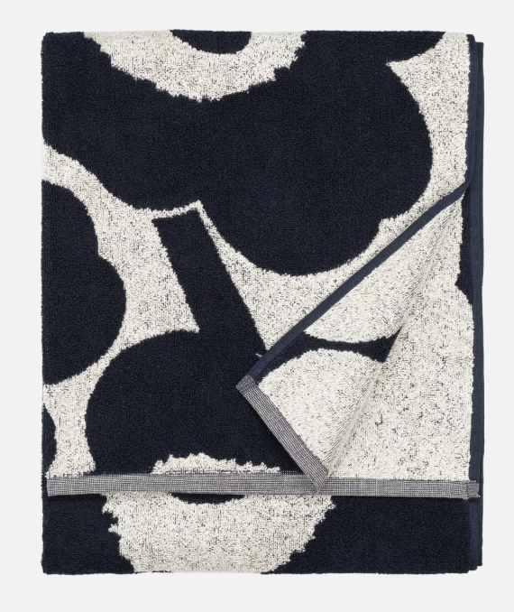 Made from a cotton and linen blend, this terry hand towel features the cotton and dark blue coloured Unikko pattern. The towel has two different coloured sides because the dominant colour on the reverse is the opposite of the right side.